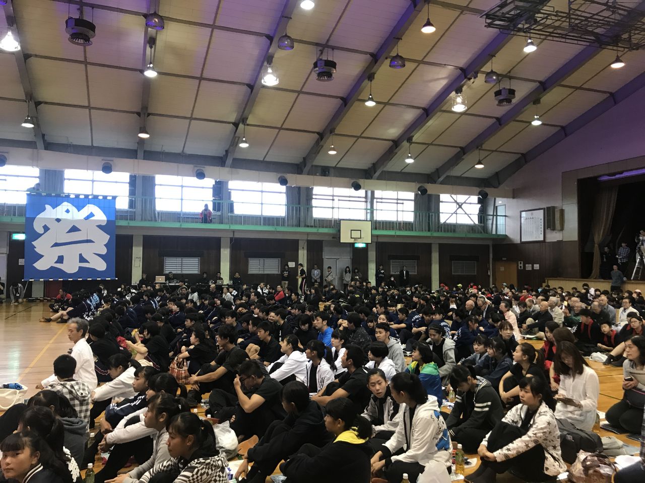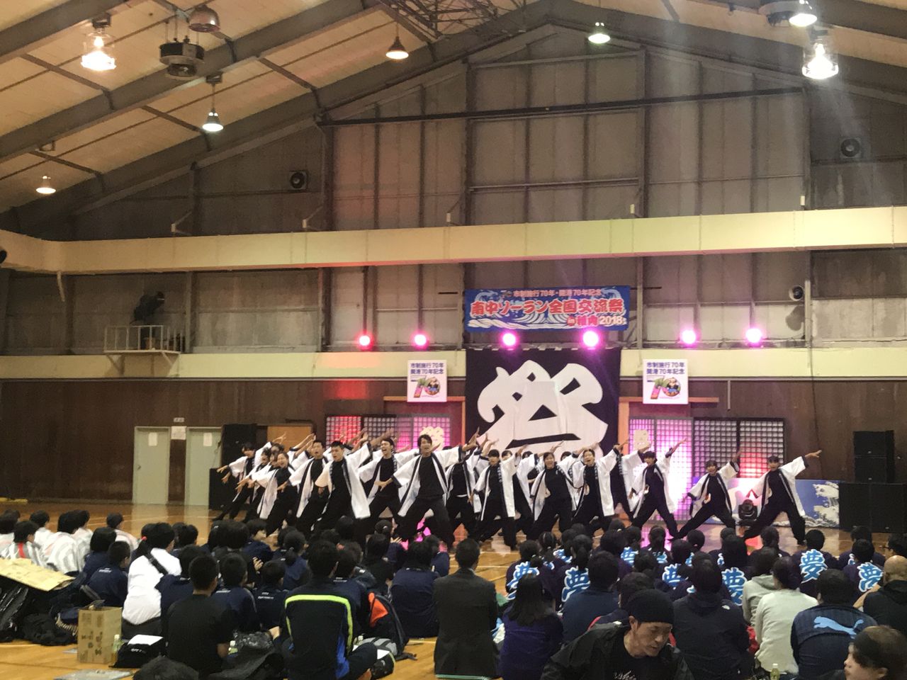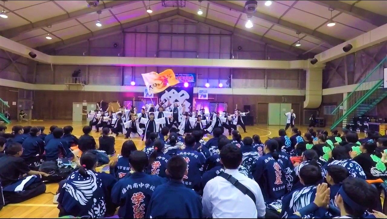 急きょ設営された体育館ステージは、踊り子以外は入場できないという制限がありましたが、それもそのはず、急きょの開催にもかかわらず、たくさんの学校やチームが参加し、会場は熱気あふれる満員の状況となっていました。