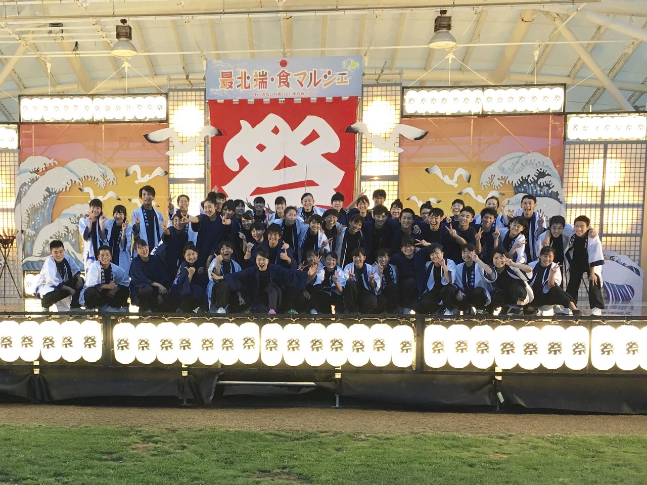 ちょうど雨も上がり、夕方のステージは照明が映え、とてもいい雰囲気でした。聞けば、音楽もかけられます、との事で、同じく遠方から来られた札幌新陽高校のメンバーとも一緒に、せっかくなので南中ソーランを踊らせて頂きました。